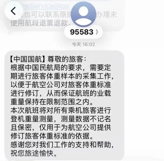 有网友近日发文称,在乘坐中国国际航空航班前,被要求现场称量体重,此事随即引发广泛关注。据网友展示的航司短信说明,此举是依据中国民航局要求,定期开展旅客体重样本采集工作,旨在为航空公司修订旅客体重标准提供数据支持。
