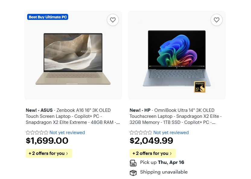 2025年9月底,高通发布了新一代PC笔记本平台骁龙X2 Elite、骁龙X2 Elite Extreme,如今半年过去了,相应的笔记本平台终于上市了!在美国百思买上,已有三款新品率先首发,分别是: