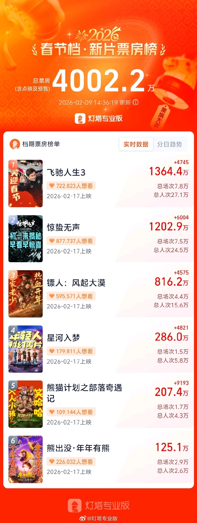 多部定档2月17日(大年初一)的影片展开票房角逐,其中《飞驰人生3》一马当先,成为当前春节档预售的领跑者。