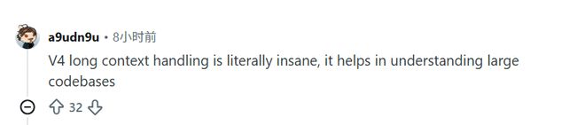 资深用户a9udn9u直言V4处理长文本的能力“简直疯了”(absolutely insane),在理解超大型代码库时提供了巨大帮助。