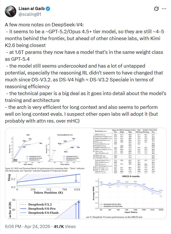 知名博主Lisan al Gaib认为V4目前处于GPT-5.2或Opus 4.5+的级别,虽然落后于顶尖闭源模型约4到5个月,但领先于其他中国AI模型,位列其次的是Kimi K2.6。在1.6万亿参数规模下,V4的重量级已经与GPT-5.4相当。他还提到,相关技术论文详细介绍了模型的训练和技术架构,推测其他开源实验室会采用这种在长上下文中表现优异的架构。