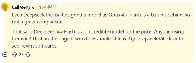 也有冷静的声音。CallMePyro等用户客观指出V4-Pro在综合素质上与Claude 4.7仍有差距,但建议大家至少试试V4-Flash,和谷歌Gemini 3 Flash比一比。
