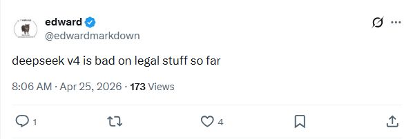 也有用户提到DeepSeek V4在法律任务上目前表现很差。