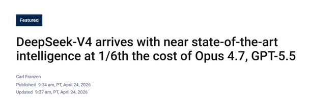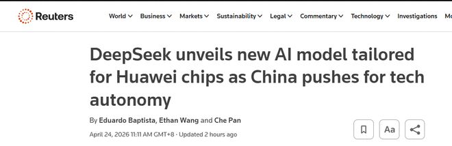 DeepSeek V4刚上线,海外媒体有人看到性能,有人看到价格,也有人看到华为。彭博把它写成对OpenAI和Anthropic的有力挑战,《财富》盯上的是它再次把价格打到地板附近;路透社的切口更敏感:这不只是一个更便宜、更擅长长文本的新模型,并且DeepSeek首次明确披露,V4系列已适配华为升腾芯片。当然路透社也没忘补一刀,称V4仍落后于部分顶级闭源模型,而且暂时不支持多模态。