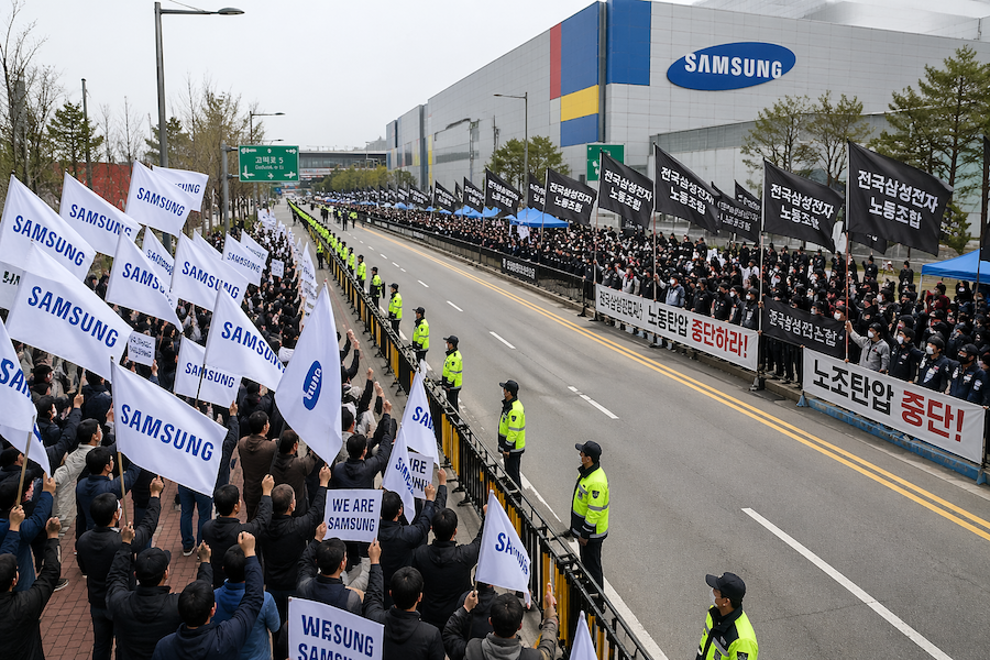 创下史上最佳单季业绩的三星电子,正陷入一场前所未有的严重劳资危机。三星全国工会因不满薪资集体谈判陷入僵局,扬言发动大罢工,并向公司要求超过40万亿韩元的绩效奖金。面对工会索要巨额绩效奖金并威胁发动大罢工的举动,三星股东宣布将于4月23日举行“反罢工”集会,公开抵制工会的相关诉求。