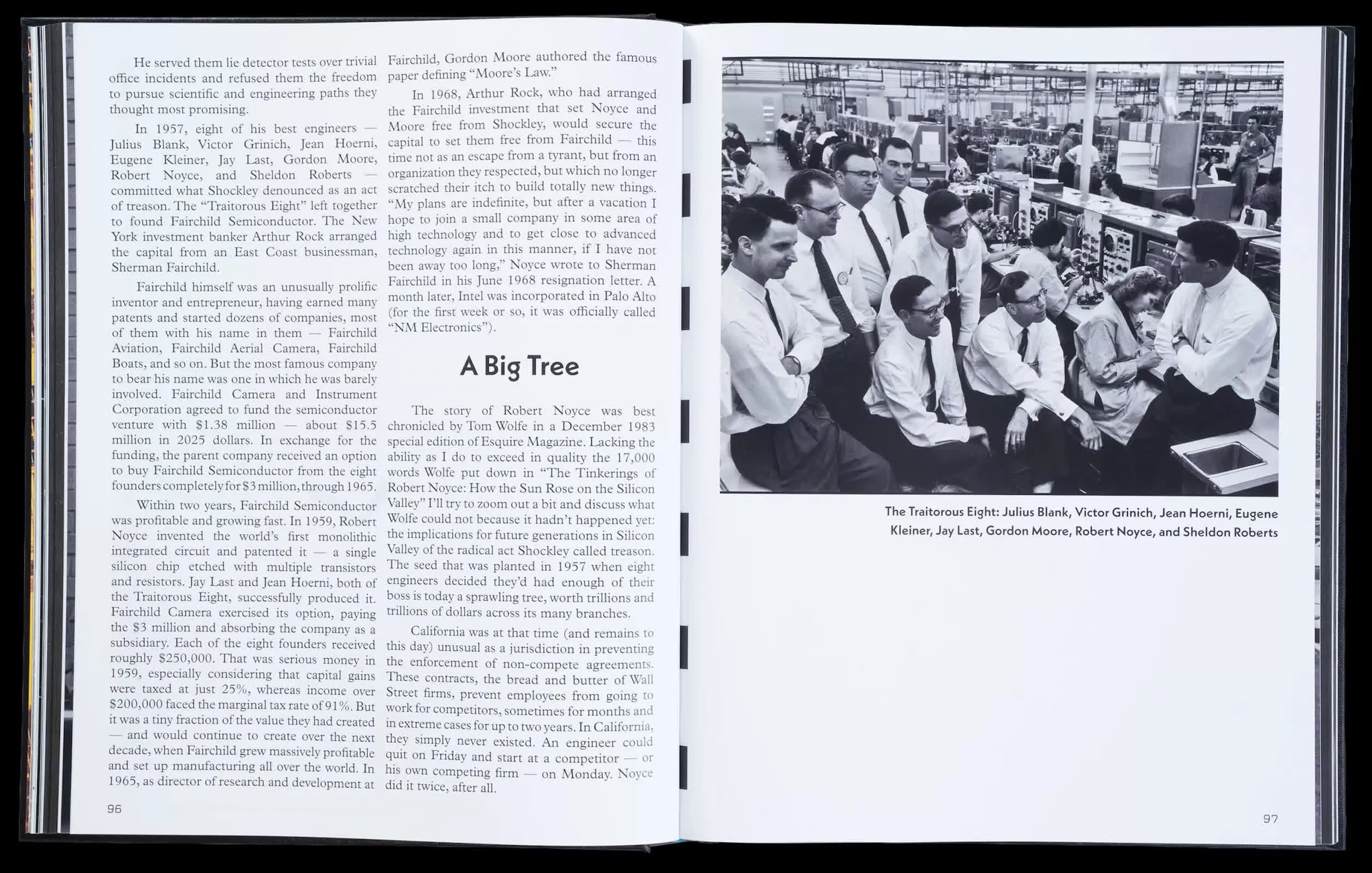 书的中段转向半导体行业中人们耳熟能详的“传说”,但重点落在制度与复利效应上。 Maxwell Meyer 撰写的《And Then There Were Eight》(然后就剩八个人)重述“叛逃八人组”的故事,展示他们如何为硅谷此后“分拆创业”的公司文化建立范式。 Rob L’Heureux 的《Moore’s Laws》(摩尔定律们)则把摩尔的预言视作一项跨越数十年的运营难题,而不是简单口号:要通过设计、光刻与资本开支的多重博弈来持续兑现。 在《ASML’s Throne》(ASML 的王座)中,Stephen McBride 则追溯一家曾经举步维艰的荷兰公司如何最终承担起“打造世界上最重要、最复杂机器”的角色——指的正是如今主导地缘政治讨论的前沿光刻系统。