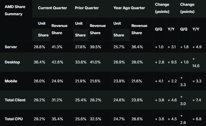 与桌面端一样,AMD移动CPU业务也实现了3.3个百分点的同比增长,市场份额为26.0%,营收份额为24.9%。