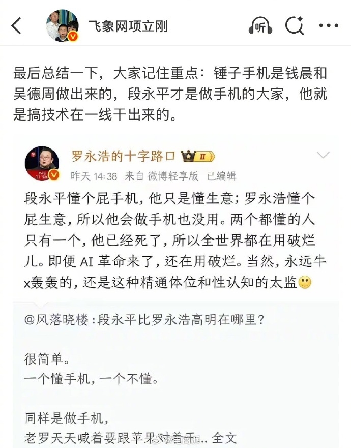 近日因为罗永浩的一个发言,再次引起了项立刚的不满,后者也是发文吐槽。近日,罗永浩发文称,段永平不懂手机,只是懂生意,而他自己不懂生意,所以会做手机也没用。于是乎项立刚本人发文进行了回应,直接称,“自己(罗永浩)不懂,还没有自知之明,这样的人一定是有很多的,为什么他们粉罗永浩,因为他们自己虽然懂得不多,没有自知自明,但是也想和罗永浩一样出名。”
