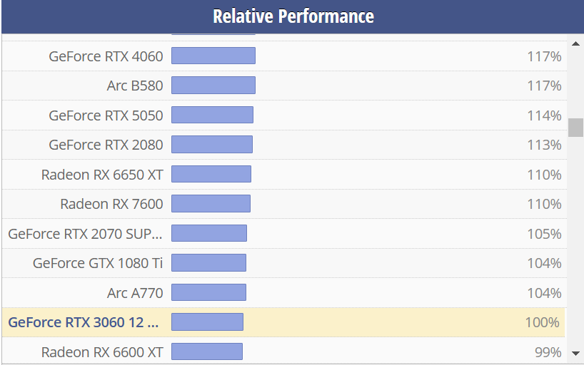 RTX 3060的性能目前跟A770、RX 6600 XT差不多,比RTX 4060落后也就15%左右,不过这个是12GB版的,如果是8GB版的,性能还会更低一些。