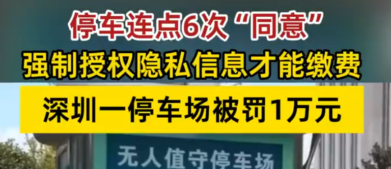 近日,深圳市监局曝光一批停车收费乱象,其中某地下停车场因强制要求车主连点6次同意才能缴费的操作,涉事企业已被罚款1万元。据悉,该停车场未设置人工收费通道,所有缴费操作均需通过线上完成,车主需逐一同意隐私授权、位置信息采集等条款,全程需点击6次同意,否则无法完成缴费。