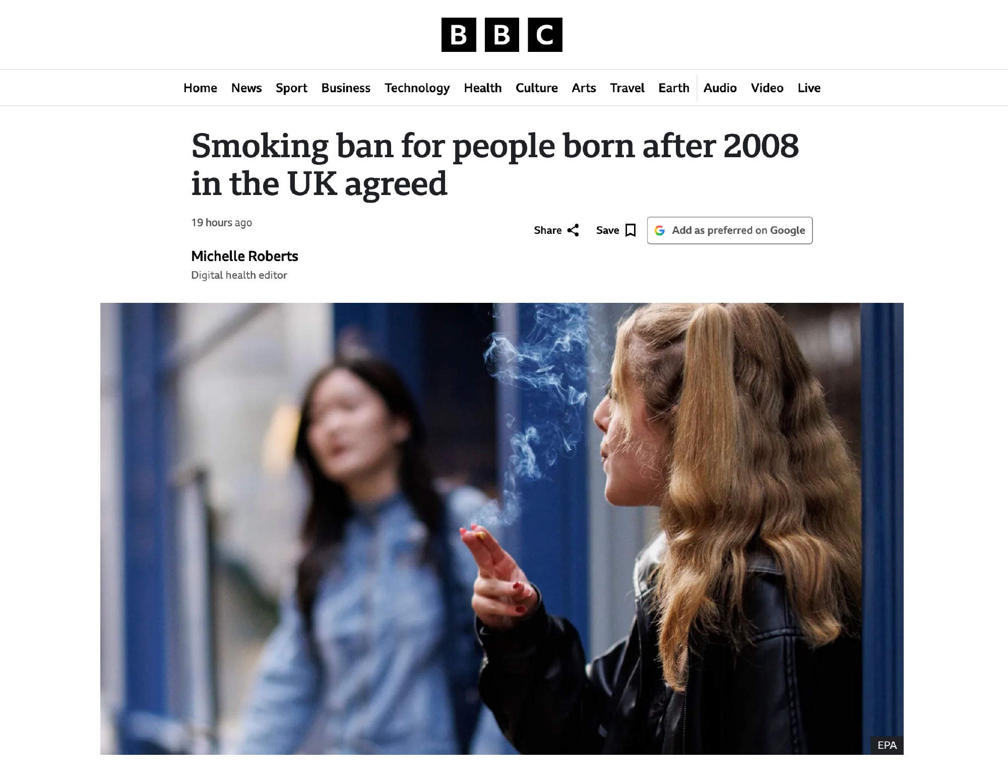 英国卫生大臣韦斯·斯特里廷称这是“国民健康的历史性时刻”,将打造“第一代无烟者”,让他们免受终身成瘾与烟草的危害。