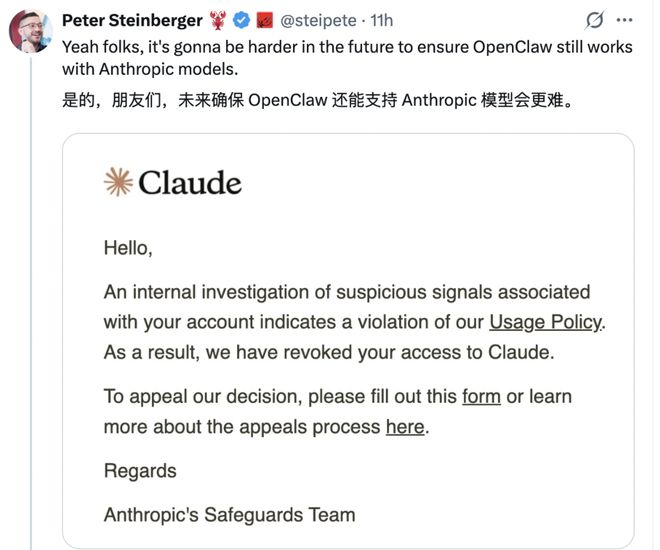 Anthropic 与 OpenClaw 的“爱恨情仇”到底要上演到何时?上周,Anthropic 刚官宣“封杀”OpenClaw,这周,就直接将“OpenClaw 之父”Peter Steinberger“封杀”了……今天一大早,OpenClaw 创始人 Peter Steinberger 就在 X 上发文:“是的,各位,未来要确保 OpenClaw 继续与 Anthropic 模型兼容将会更加困难。”