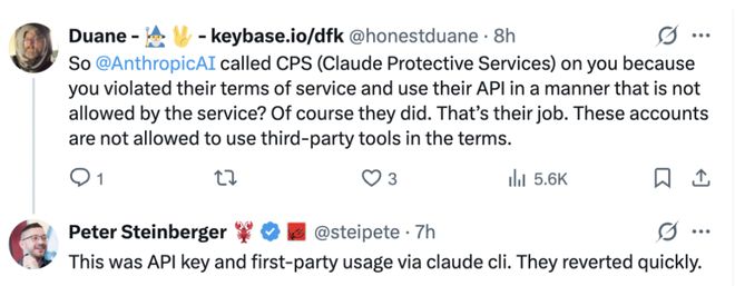 “是因为你违反了他们的服务条款、以不被允许的方式使用 API,才对你动用了 CPS(Claude Protective Services)?那当然会这么做,这就是他们的职责。按照条款,这类账户本来就不允许通过第三方工具来使用服务。”