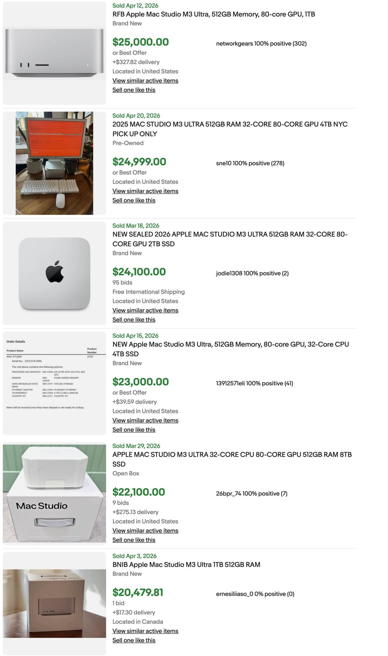 搭载M3 Ultra芯片的Mac Studio目前在二手市场上价格已经完全失控,512GB统一内存版本标价高达25000美元(约17万元人民币)。作为对比,配置16TB SSD的256GB版本在苹果官网上售价约12000美元,同样的机型,内存翻一倍,价格直接翻倍还多。