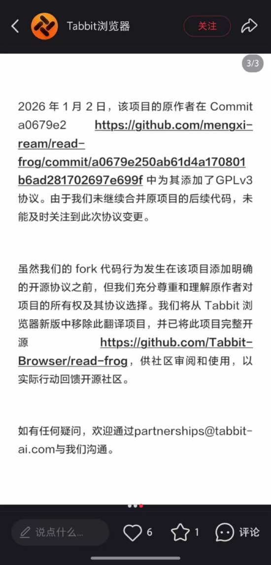 官方提到,虽然我们的fork代码行为发生在该项目添加明确的开源协议之前,但我们充分尊重和理解原作者对项目的所有权及其协议选择。我们将从Tabbit浏览器新版中移除此翻译项目,并已将此项目完整开源https://github.com/Tabbit-Browser/read-frog,供社区审阅和使用,以实际行动回馈开源社区。