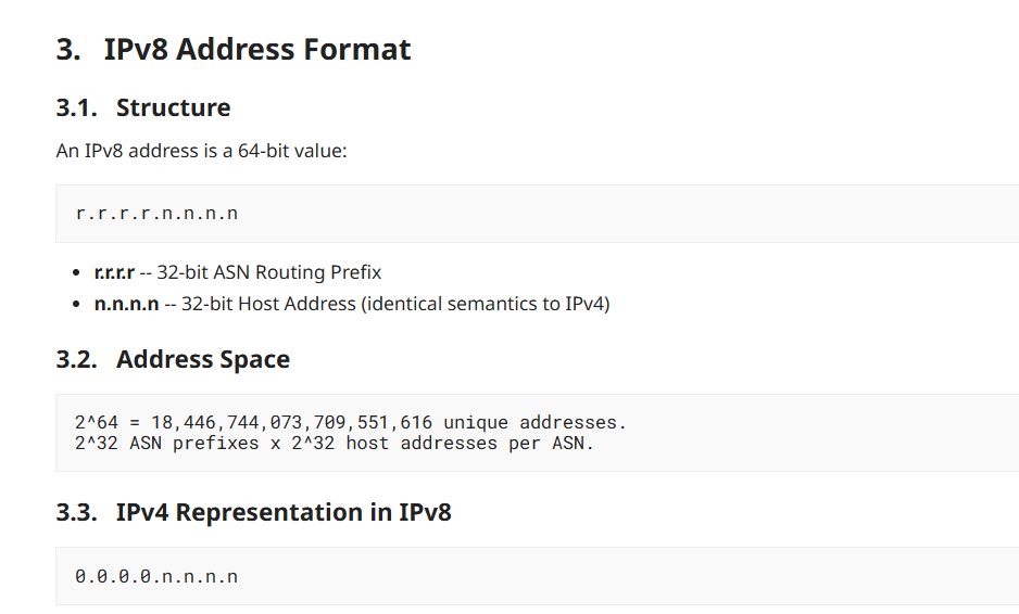 IPv8最核心的设计亮点是100%向下兼容IPv4。草案明确,IPv4是IPv8的一个真子集。根据草案定义,IPv8采用64位地址空间,格式为r.r.r.r.n.n.n.n,由32位ASN路由前缀和32位主机地址组成。