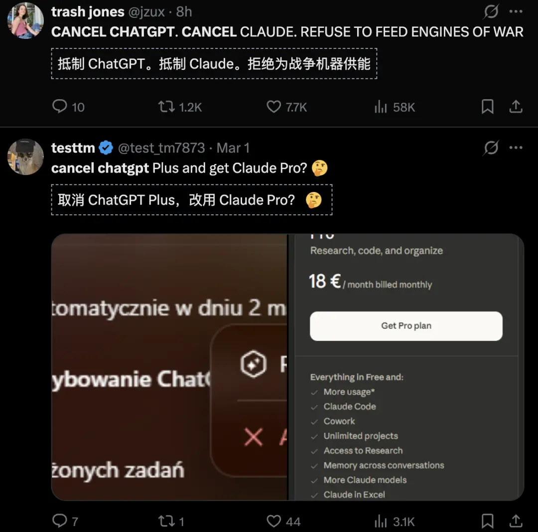 对比之下,OpenAI相当无耻,美国自发掀起卸载/取消ChatGPT运动,声势浩大,人声鼎沸!