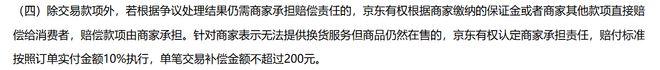 而根据京东开放平台售后服务规则,除交易款项外,若根据争议处理结果仍需商家承担赔偿责任的,京东有权根据商家缴纳的保证金或者商家其他款项直接赔偿给消费者,赔偿款项由商家承担。