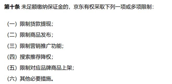 但根据京东开放平台商家保证金管理规则,未足未足额缴纳保证金的,京东有权采取限制货款提现、限制商品发布、限制营销推广功能、搜索推荐降权、限制对应品牌商品上架以及其他必要措施等一项或多项限制。