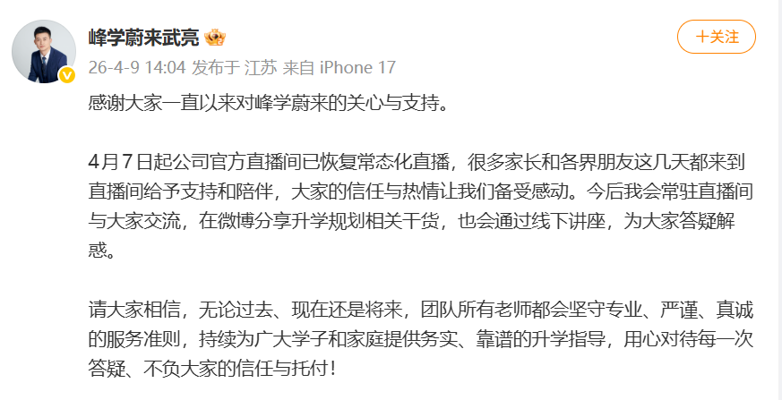 今后他将常驻直播间与大家交流,在微博分享升学规划相关干货,也会通过线下讲座,为大家答疑解惑。