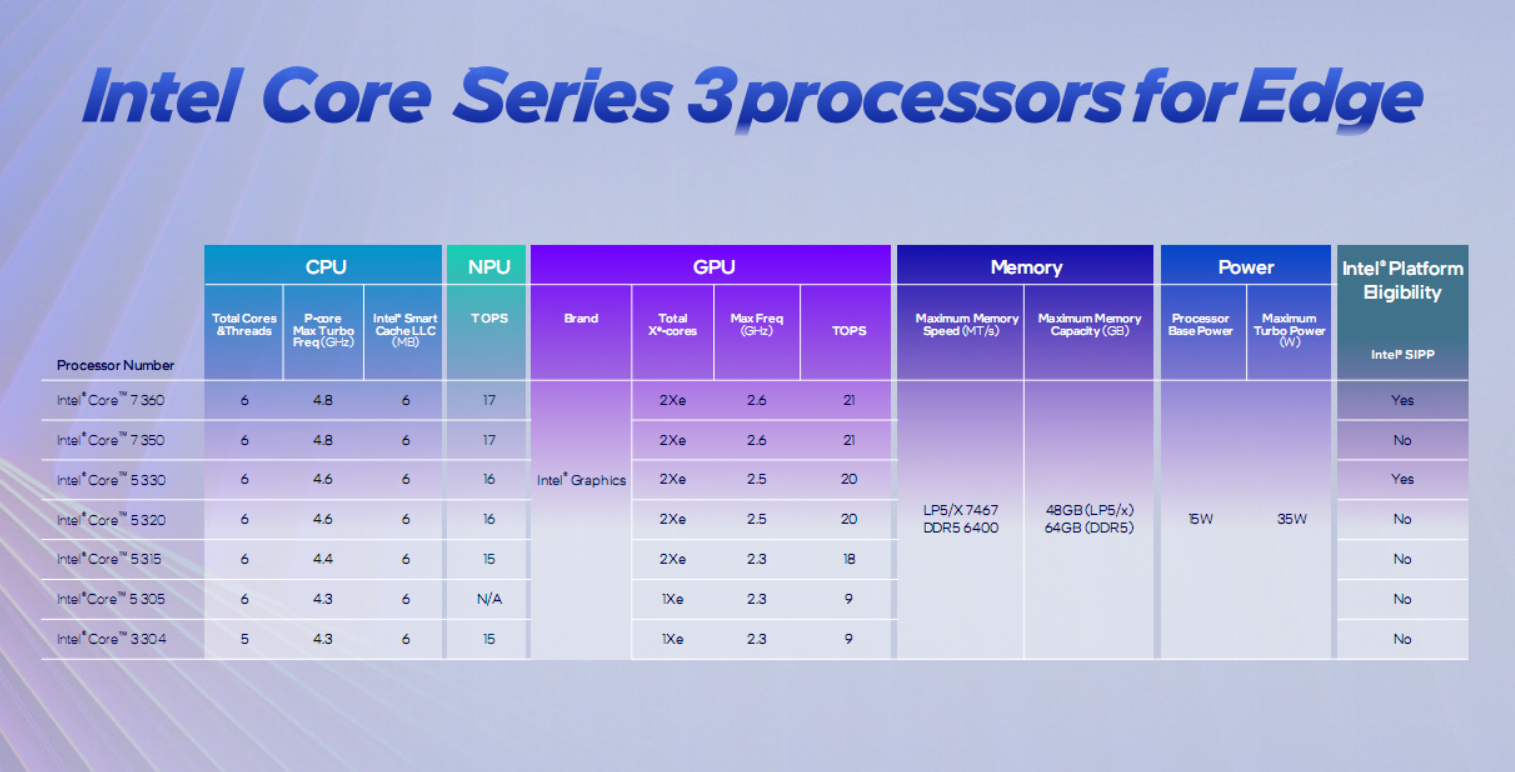 针对边缘计算领域又多了一款酷睿5 305,6核心CPU、1核心GPU,并取消了NPU。
