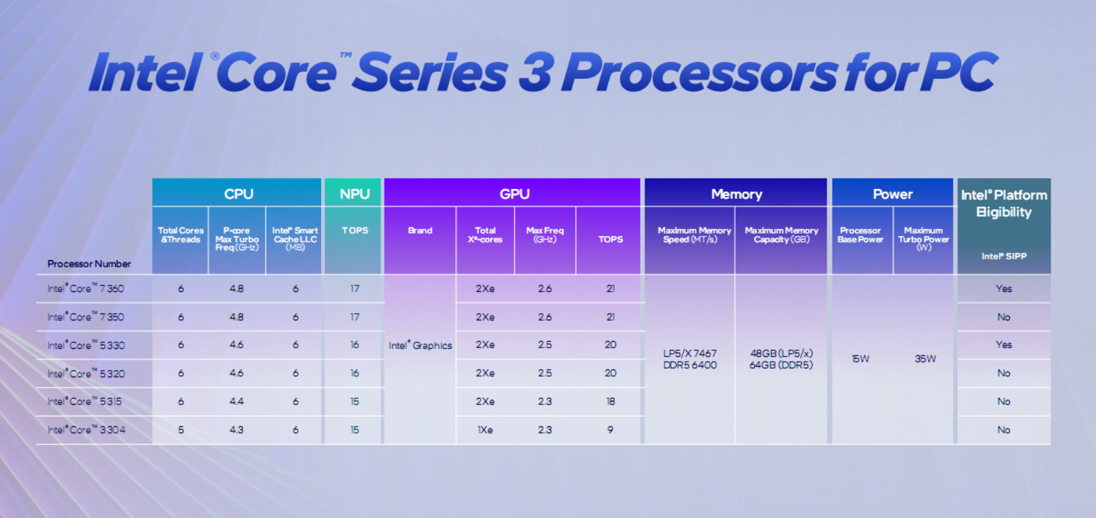 酷睿3系列同样是Intel 18A先进工艺、Cougar Cove P核+Darkmont E/LPE核混合架构、Xe3 GPU架构、NPU 5引擎,只是规格做了大幅精简。