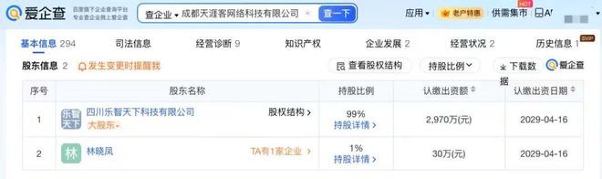 爱企查App显示,成都天涯客网络科技有限公司成立于2024年4月,法定代表人为林晓凤,注册资本3000万元人民币,经营范围包括信息系统集成服务、软件开发、国内贸易代理等,由四川乐智天下科技有限公司、林晓凤共同持股。