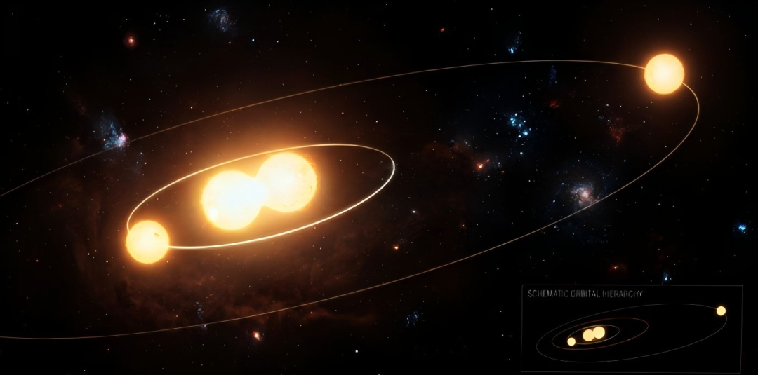 最中心的两颗恒星正在疯狂互相旋转,公转周期达到了非常离谱的3.28天。