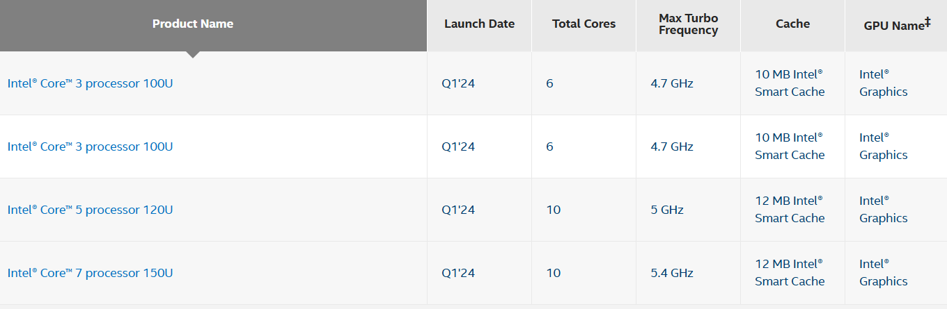 具体包括10核心的酷睿7 150U、酷睿5 120U,6核心的酷睿3 100U。