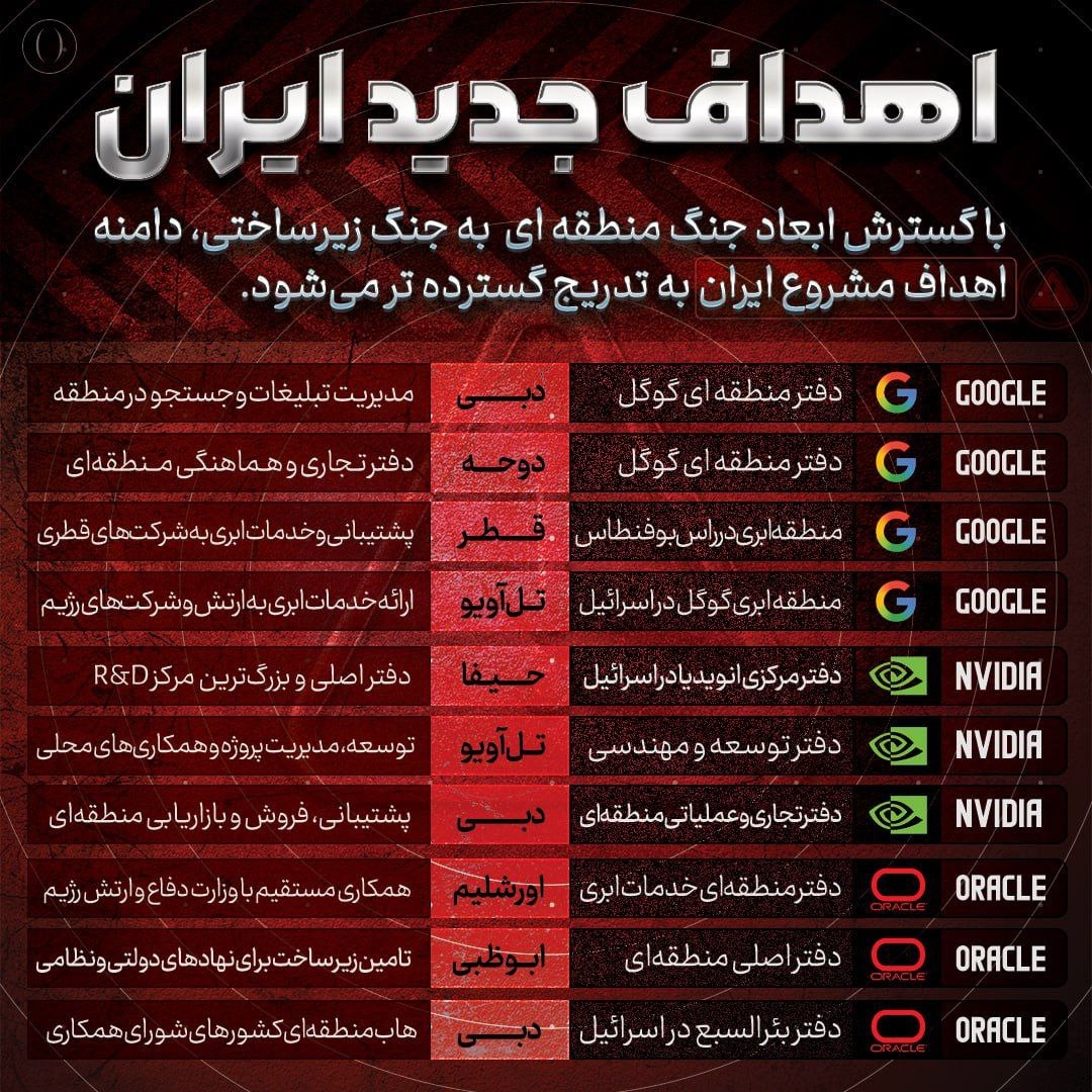 伊朗塔斯尼姆通讯社 (Tasnim) 公布了一份近30个地点的潜在打击目标名单,涵盖多家大型美国科技公司,称其为“敌方技术基础设施”。据与伊朗伊斯兰革命卫队有联系的伊朗通讯社塔斯尼姆报道,随着与美国的紧张关系持续升级,伊朗可能会将目标对准美国大型科技公司。