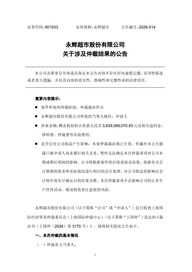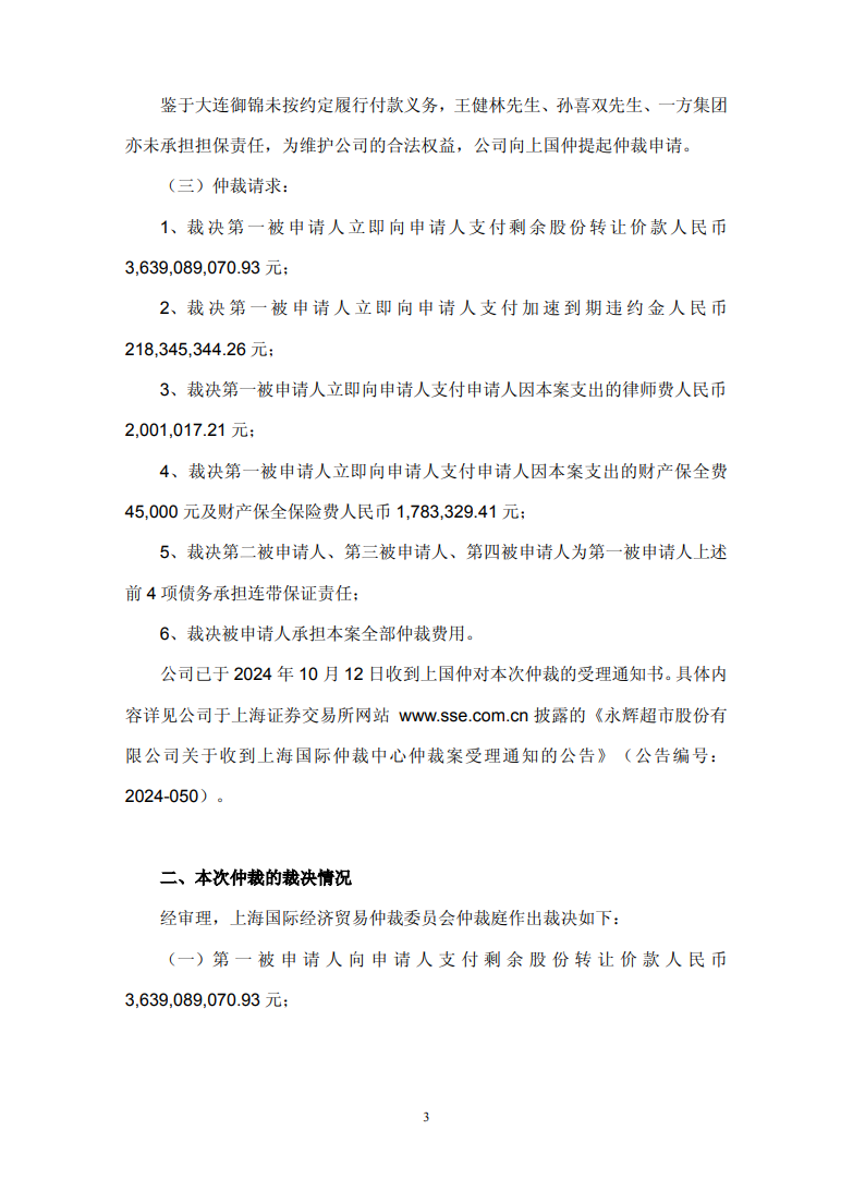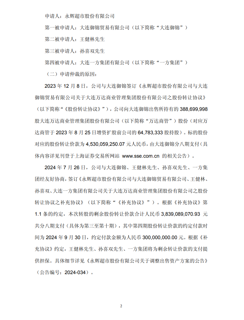 永辉超市今晚发布公告,公司与万达商管股权转让款的仲裁案件迎来终局裁决,成功追回超38亿元款项,王健林等人需承担连带保证责任。事情起因是永辉此前出售万达商管股份,交易总价45.3亿元,约定分期支付。受让方大连御锦从第二期就开始逾期,后续虽重新约定付款计划并追加担保,但依旧没有按时履约,永辉只能提起仲裁维护自身权益。