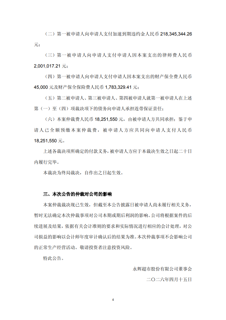 按照裁决要求,相关款项需要在裁决生效后20日内履行完毕。截至公告发布,相关方还未履行付款义务,暂时无法确定对公司本期或期后利润的影响,但不影响公司正常生产经营。