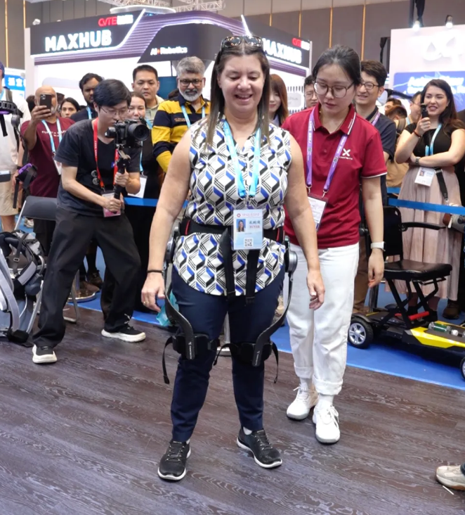 目睹这一幕,她的同伴们激动得热泪盈眶。据展位工作人员介绍,这款产品是腰部助行外骨骼,主要帮助行动不便的人群改善行走能力。其工作原理是:通过感知人体微动作识别运动意图,再利用电机发力,辅助双腿完成行走动作。