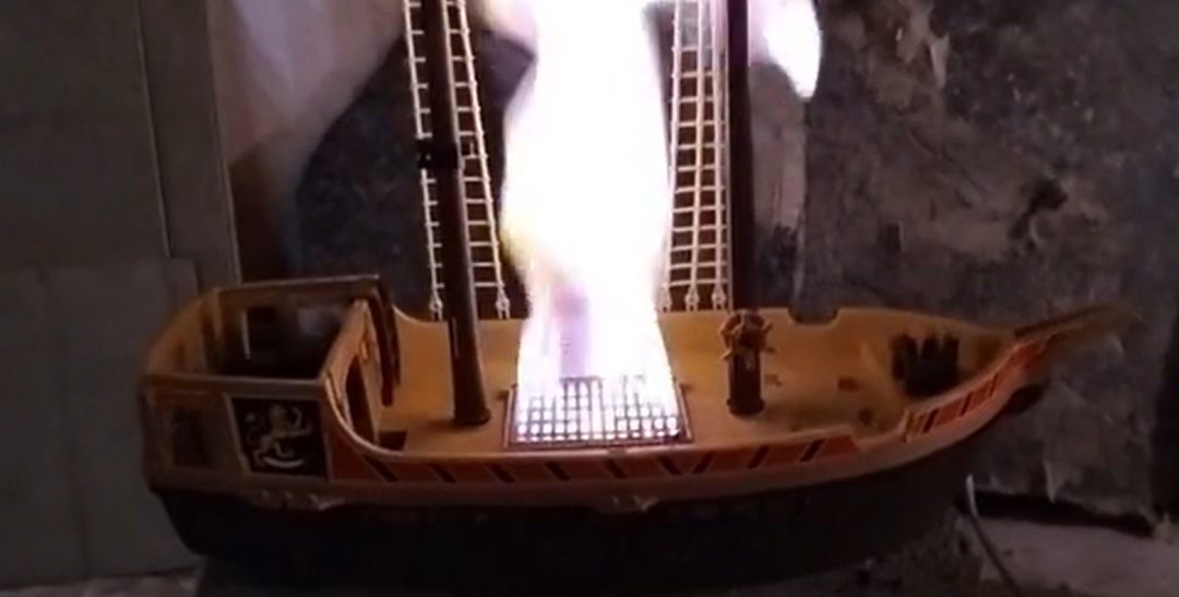 他当时用纸块代替木桶,用丁烷气体模拟泄漏的酒精,在火花的引燃下,一个巨大的火球爆发而出。