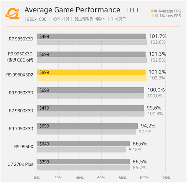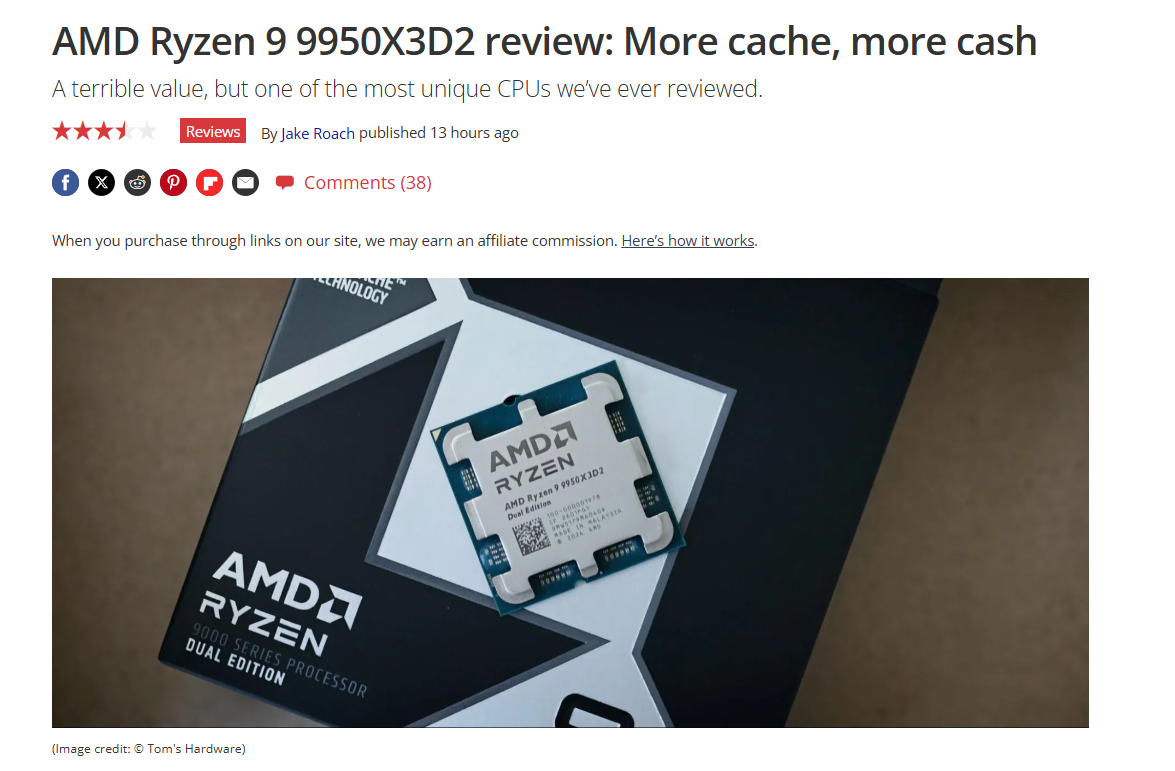 Tom's Hardware的评测更标题直接用“更多缓存,更多票子”定调,直言它在游戏里对比9950X3D没有任何优势,甚至锐龙79800X3D和9850X3D的帧率还要略高一点。