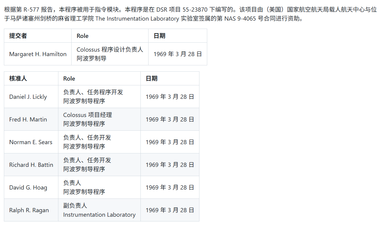 这些代码由虚拟阿波罗制导计算机项目(Virtual AGC)团队与麻省理工学院(MIT)博物馆合作完成的数字化处理,都是从印刷本电子化图片抄录、改编而来的。