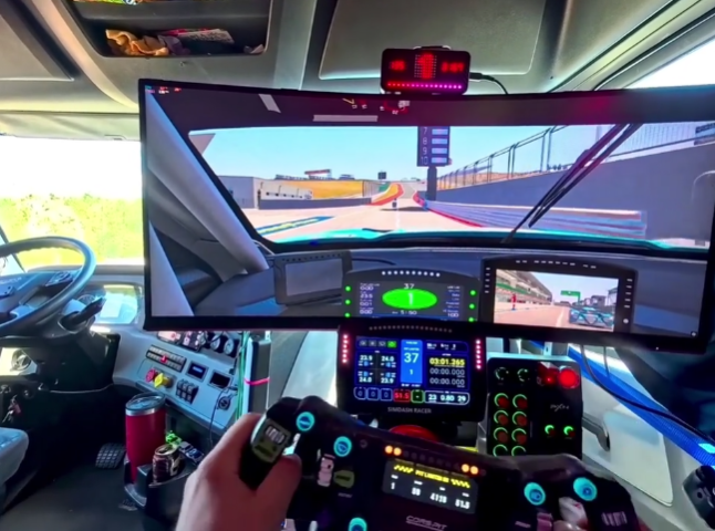“自从装了这套设备,我就一直盼着堵车,就为了拍这段视频,哈哈。”ZanaZamora在帖子中调侃道。令人意外的是,这位常年开卡车的司机,堵车时并未选择模拟卡车驾驶,而是打开了《神力科莎:竞速》(Assetto Corsa Competizione),过了一把赛车瘾。
