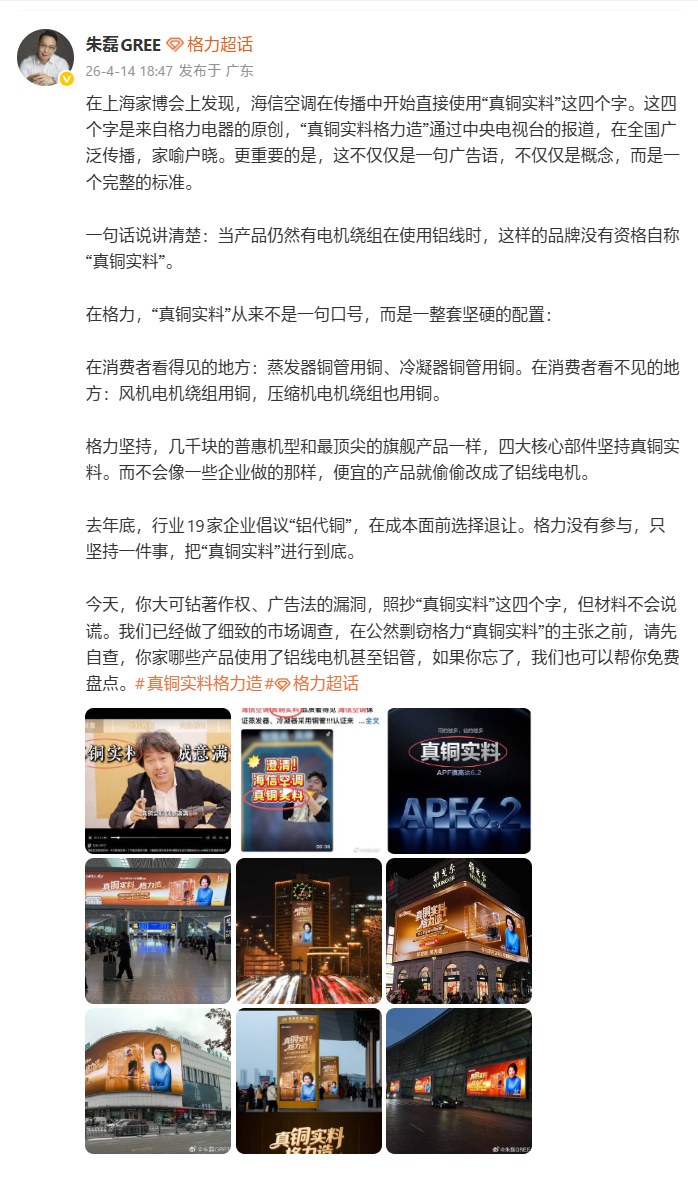 格力市场总监朱磊日前发文称,海信空调在传播中开始直接使用“真铜实料”这四个字,这四个字来自格力电器的原创。他表示:“当产品仍然有电机绕组在使用铝线时,这样的品牌没有资格自称真铜实料”。