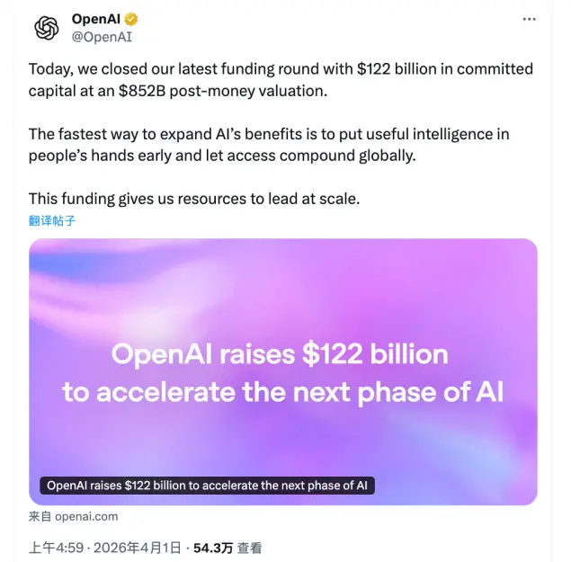 备受瞩目的OpenAI最新轮次融资,终于落下定音槌——当地时间3月31日,OpenAI宣布完成了新一轮融资,融资规模达到惊人的1220亿美元,而投后估值则达到了8520亿美元。