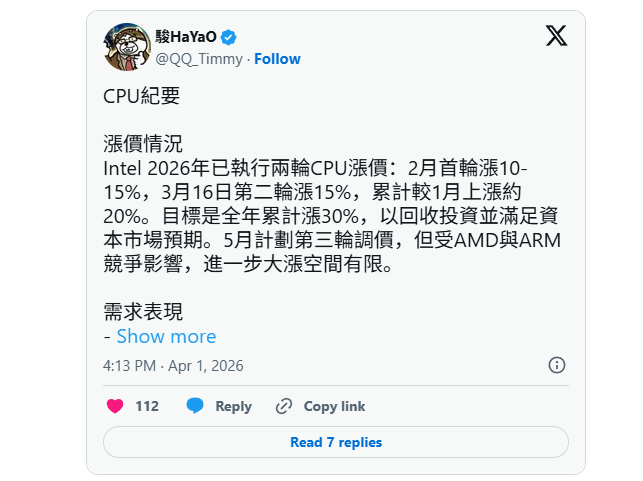 2026年开年仅三个月,Intel就已连续落地两轮消费级CPU涨价,全年累计涨幅最高将冲击30%。供应链独家爆料显示,Intel今年2月完成首轮调价,涨幅区间10%-15%。3月16日开启第二轮涨价,再度上调15%,两轮过后CPU价格较今年1月累计上涨约20%。