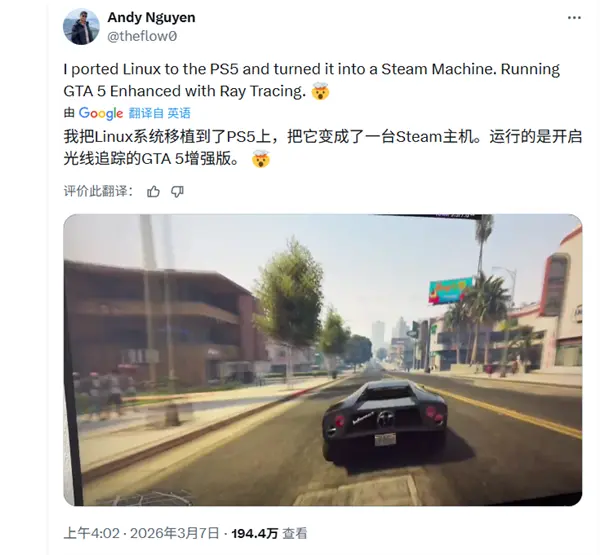 从Andy发布的视频能看到,这台被改造的是PS5 Slim机型,运行着完整版Linux系统,功能无任何缩水。改造后它能胜任普通PC的所有操作,最惊喜的是,还能通过Steam平台运行《GTA V 增强版》。