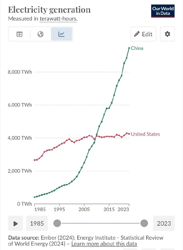 2023年数据显示,美国的发电量为4.4万亿千瓦时,印度为1.9万亿千瓦时,而中国则达到了惊人的9.4万亿千瓦时(几乎是印度和美国的5倍和2倍多)。