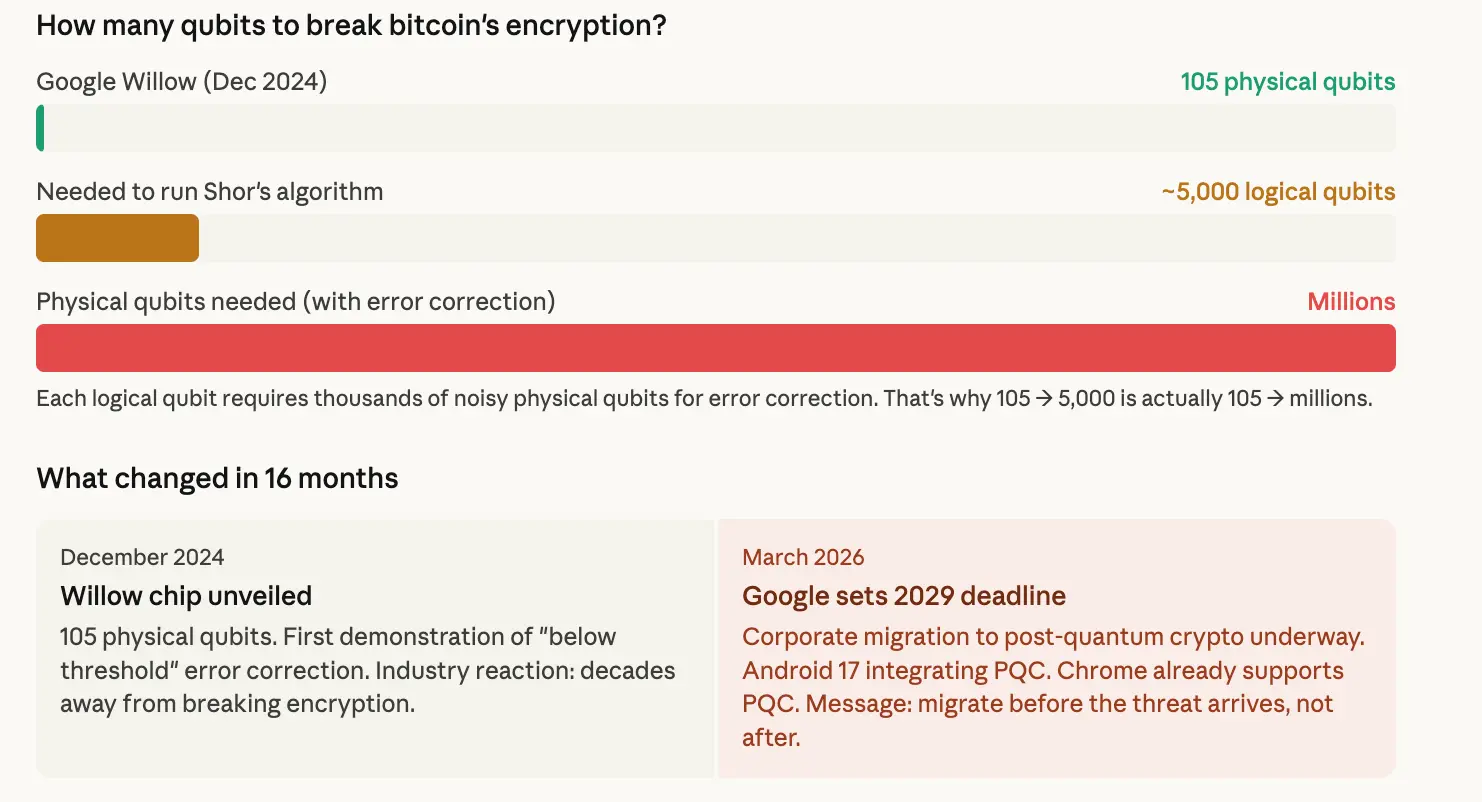 4月1日消息,Google研究团队近期提出,向“后量子密码学”(Post-Quantum Cryptography)过渡的时间节点为2029年。该时间表意味着,比特币及其他加密资产需在未来数年内完成底层技术升级,以抵御潜在的量子计算破解风险。