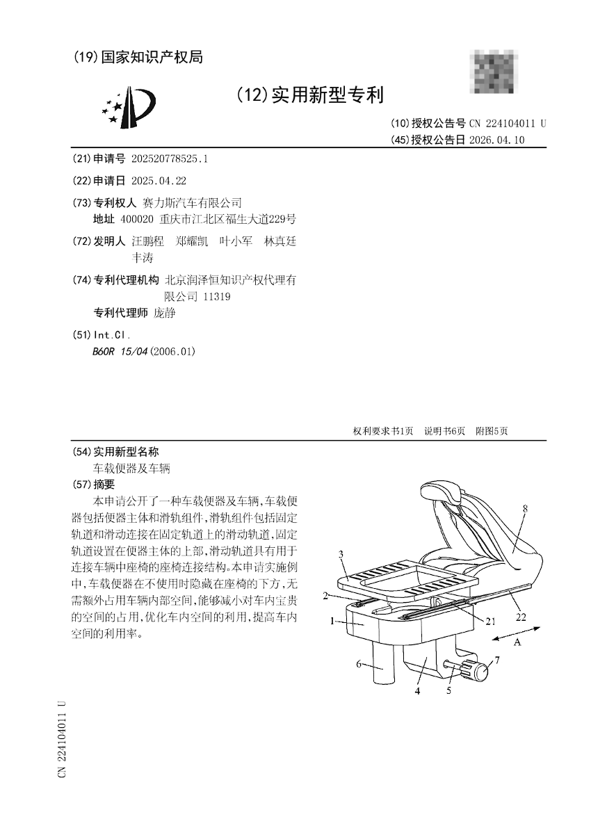 据国家知识产权局中国专利网,赛力斯汽车有限公司申请的“车载便器及车辆”实用新型专利现已正式获得授权,授权公告号为CN224104011U。该专利于2025年4月22日提交申请,本月10日获得授权,由便器主体加滑轨构成,其中滑轨分固定轨和滑动轨,滑动轨连着座椅,平常隐藏在座位下方,不占空间,外面难以看出,使用时拉出即可应急,用完推回原位。