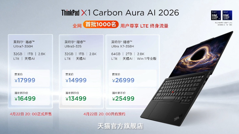 联想今日正式发布 ThinkPad X1 Carbon Aura AI 2026 笔记本,售价14999元起。设计方面,该机型轻至约984克,薄至14.3毫米。A面采用再生碳纤维黑色漆面,C/D壳选用再生镁铝合金材质,在进一步减轻机身重量的同时,兼顾了出色的抗摔与抗压性能。经过严苛测试,能够轻松应对出差途中的轻微颠簸和意外磕碰。