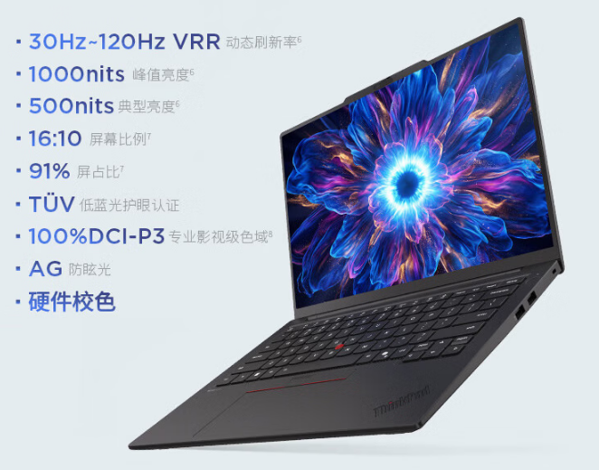 屏幕方面,ThinkPad X14 AI 2026配备了一块2.8K高刷真彩屏,具备超高分辨率、100% DCI-P3专业影视级色域以及30Hz~120Hz动态刷新率,配合91%的高屏占比,视野更开阔,沉浸感十足。