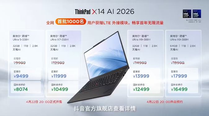 联想ThinkPad X14 AI 2026今晚正式发布,售价9499元起。据介绍,ThinkPad X14 AI 2026采用碳纤维增强材质打造,整机重量约1.2 kg,厚度仅15 mm,单手即可轻松握持,放入公文包或双肩包几乎不占空间。