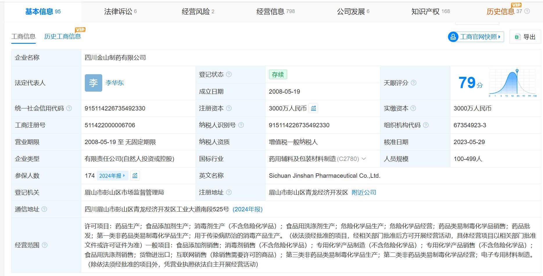 根据天眼查提供的公开信息显示,涉事原料的供应方四川金山制药有限公司成立于2008年5月,注册地址位于四川省眉山市,法定代表人为李华东。该药企的注册资本是3000万人民币,具备一定的生产规模。