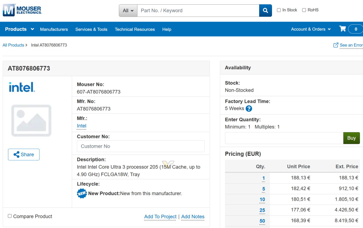 Intel Arrow Lake入门级的酷睿Ultra 3 205桌面处理器,出现在法国零售商PC21的产品页面上。页面显示,Intel 酷睿Ultra 3 205的编号为AT8076806773,采用LGA1851接口,15MB缓存,最高睿频4.90GHz。