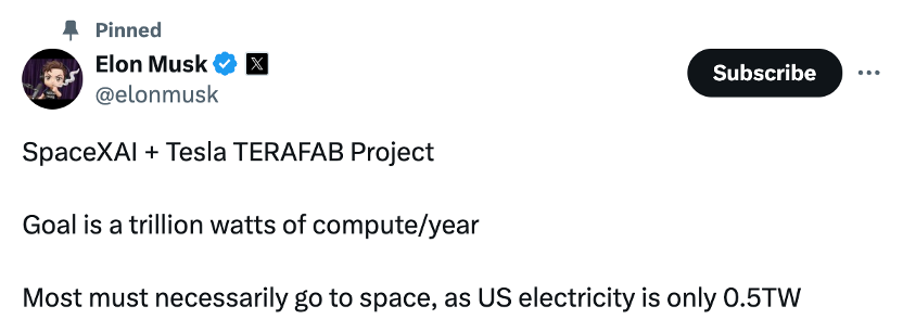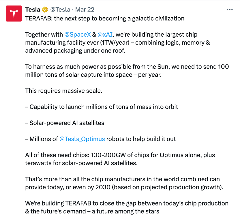 另据彭博社报道,SpaceX正筹备IPO,目标估值超1.75万亿美元;公司已于2026年2月完成对xAI的全股票收购,以强化AI与太空数据基础设施协同。在此背景下,Terafab不仅是制造项目,更成为连接电动汽车、AI与航天业务的底层算力枢纽。